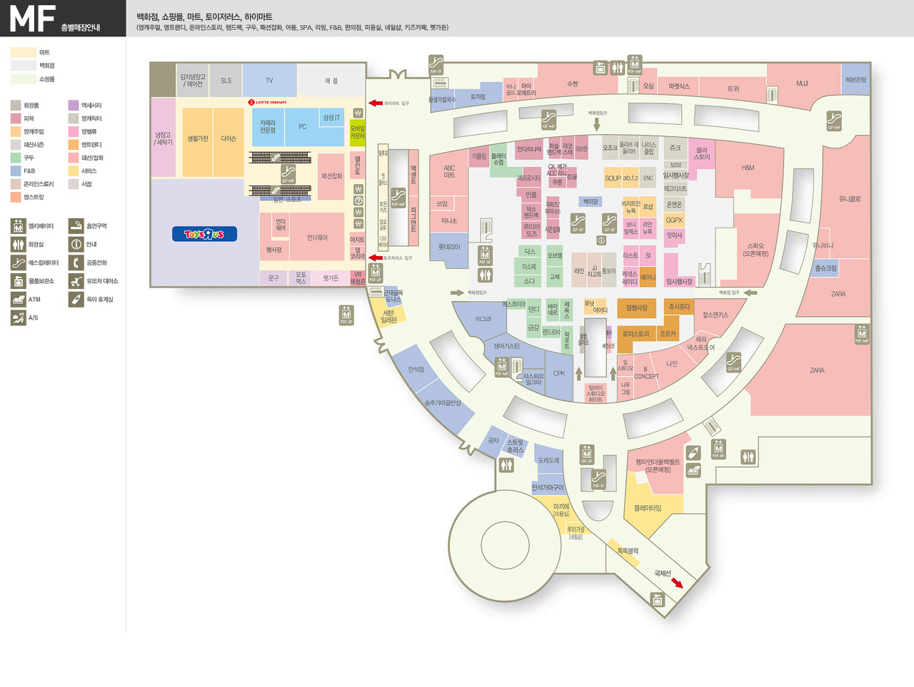 MF층 음식점 : 황생가칼국수, 토끼정, 헤븐온탑, 홉슈크림, 롯데리아, 근대골목도나스, 아그라, 생어거스틴, 파스퇴르 밀크바, CPK, 만석장, 송추가마골반상, 공차, 스트릿츄러스, 도레도레, 만석가마구이, 백미당