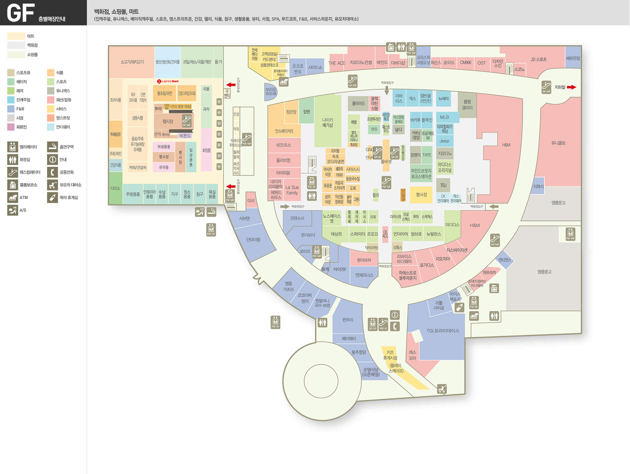 GF층 음식점 : 코코로벤또, 사이드쇼, 크리스피크림도넛, 헤븐온탑, 지파시, 사보텐, 딘타이펑, 갓덴스시, 온더보더, 로이즈, 욜레, 차이797, 엔제리너스, 명동가츠라, 코코이찌방야, 원할머니국수보쌈, 한우리, 페이웨이, 봉추찜닭, 오뎅식당, 리틀사이공, 아이스팩토리, 엔티엔스, 지파시, TGI.프라이데이스